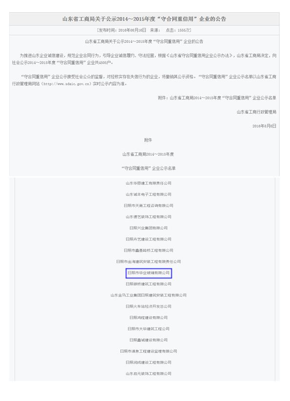 2016年8月8日,為推進山東企業誠信建設,規范企業合同行為,引導企業誠信履約、守法經營,根據《山東省守合同重信用企業公示辦法》,山東省工商行政管理局向社會公示2014~2015年度“守合同重信用”企業共4505戶,日照市華業玻璃有限公司榜上有名。
